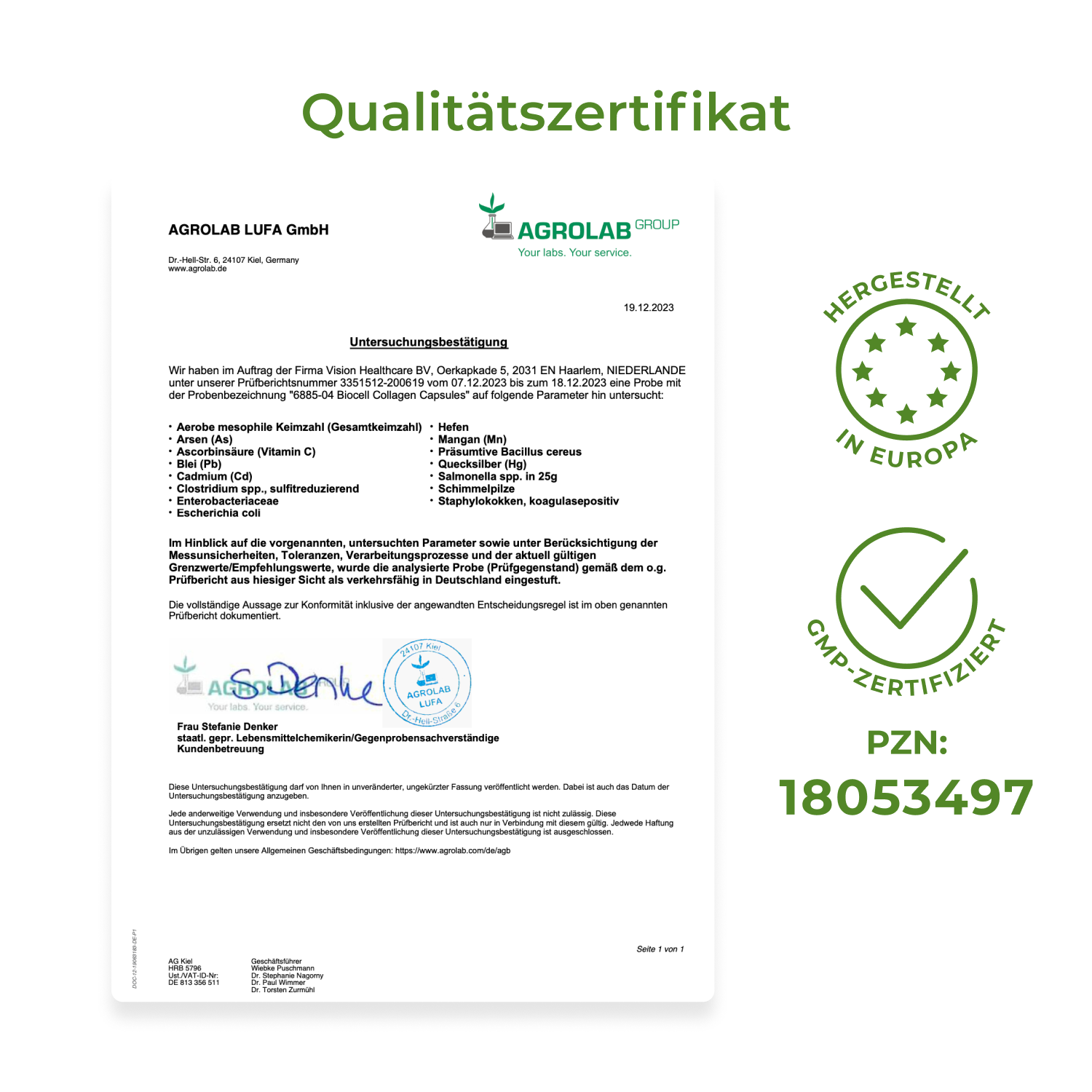 Ved valg av et høykvalitets kosttilskudd er en strengt kontrollert kvalitet avgjørende: Studier viser at inntak av BioCell Collagen® er trygt. Siden introduksjonen i 1997 har sikkerhetsaspektet blitt bevist i ulike forskningslaboratorier.